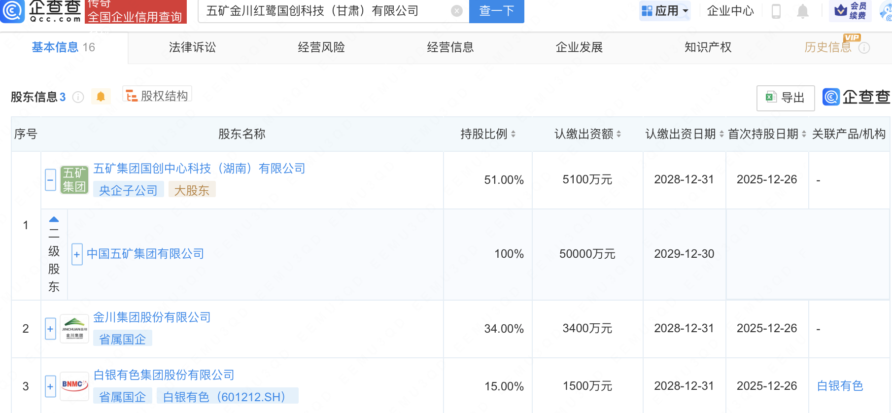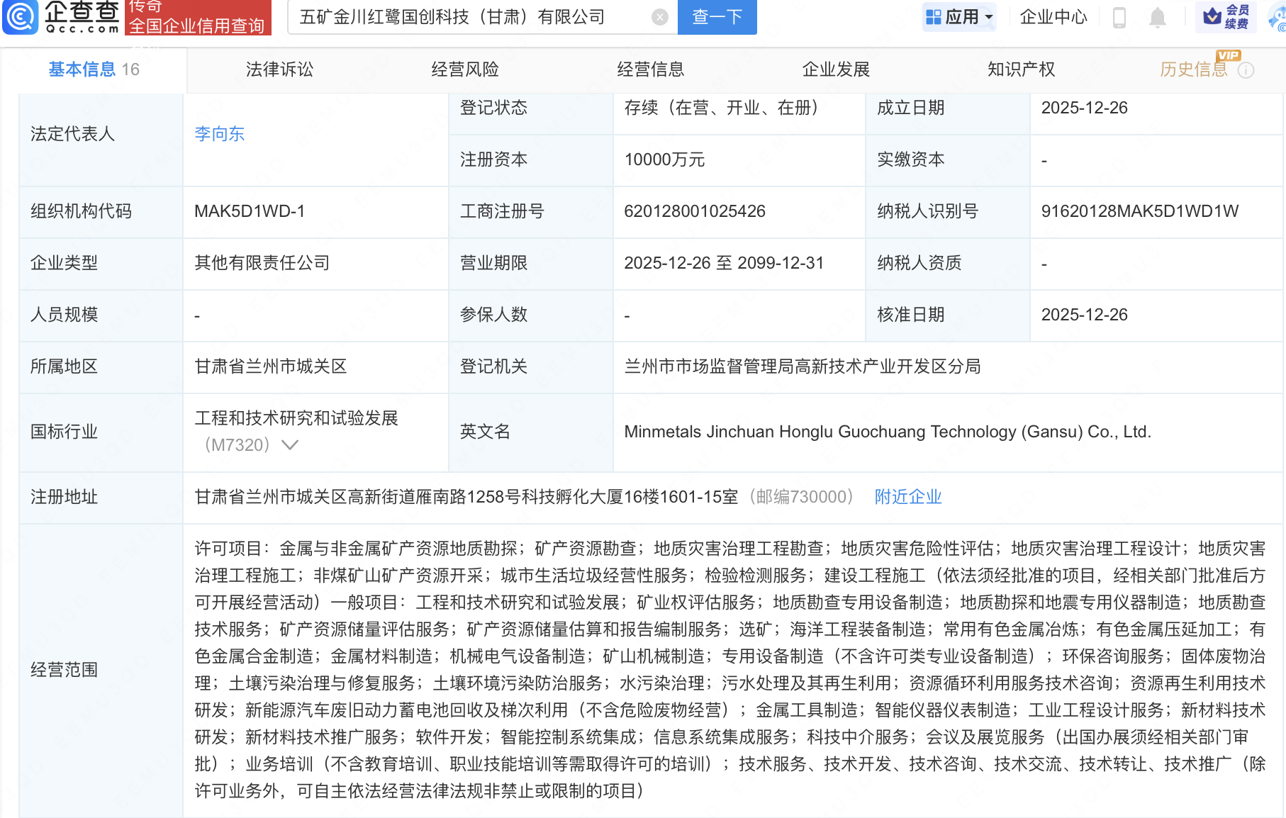 近日,五矿金川红鹭国创科技(甘肃)有限公司成立,注册资本1亿元,经营范围包含:金属与非金属矿产资源地质勘探;矿产资源勘查;地质灾害治理工程勘查;地质灾害危险性评估等。企查查股权穿透显示网上配资平台配资门户,该公司由中国五矿集团有限公司全资子公司五矿集团国创中心科技(湖南)有限公司、白银有色(601212)等共同持股。