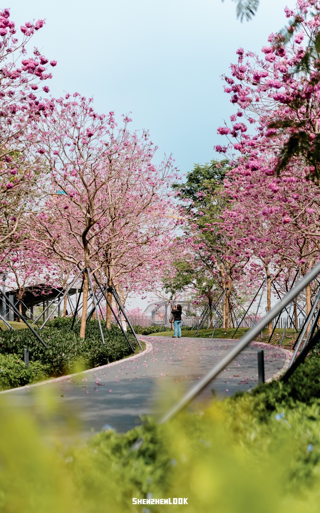 不止于新年装置打卡,在前海石公园的桂湾段,超长紫花风铃木步道已经开好,紫色花海沿着蔚蓝海岸线蜿蜒盛开,随手一拍都是浪漫大片,好像走进了童话里的梦境。